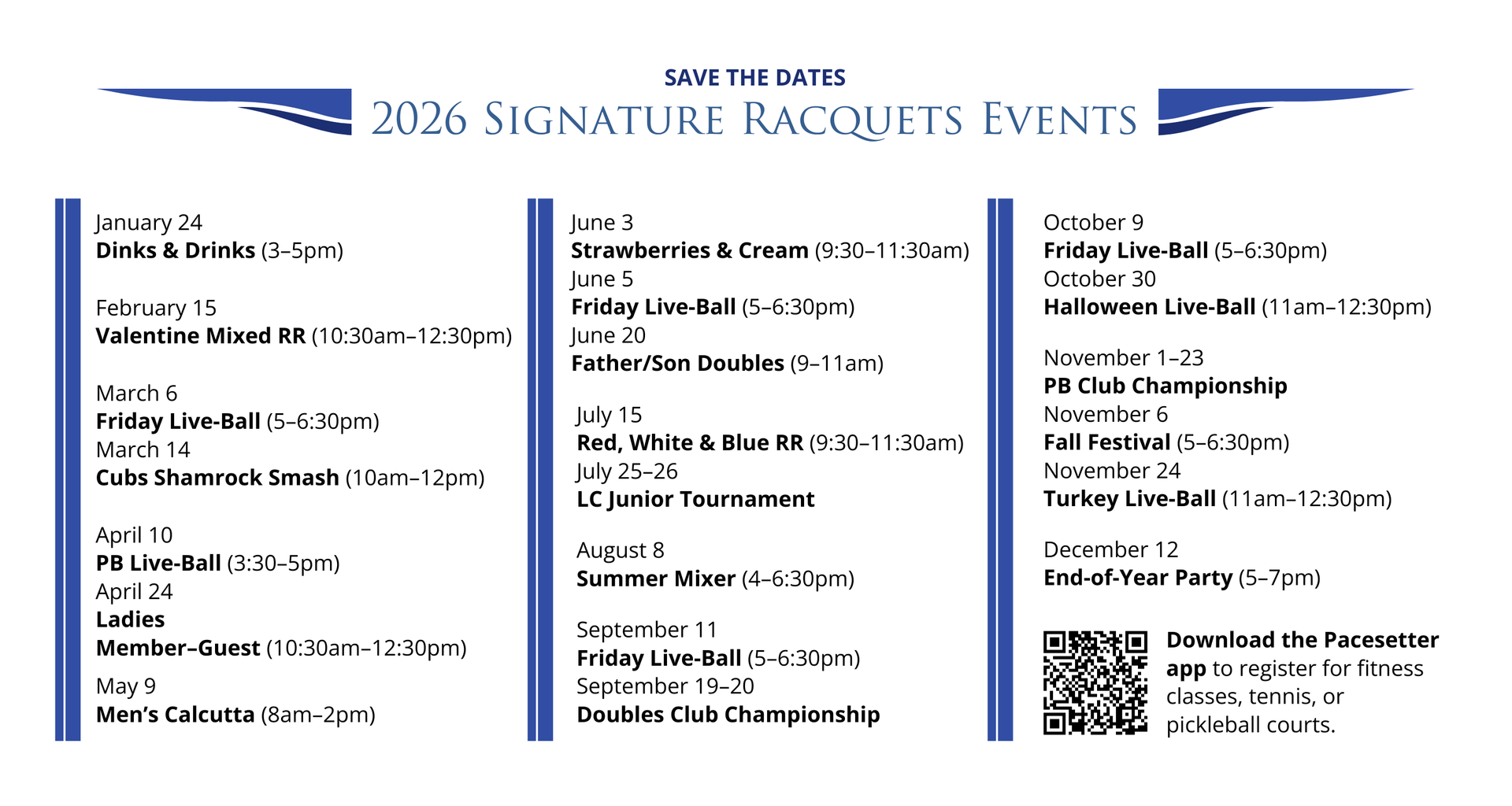 Racquets: Don’t miss the Dinks & Drinks Pickleball Mixer on Saturday, January 24, from 3:00–5:00 pm, $30pp. This event is a great way to connect and play. Click